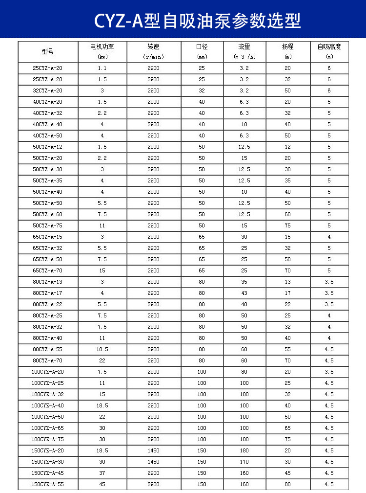 CYZ-A型軸聯式自吸油泵該自吸泵適用于石油行業、陸地油庫、油罐車的理想產品,并適合于作船用貨油泵、艙底 泵、消防泵和壓載泵及機器冷卻水循環等,分別輸送汽油、煤油、柴油、航煤等石油產品和海水、清水,介質溫度-20℃-80℃,如輸送化工液體可改用耐腐蝕 機械密封。
