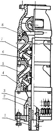 2、潛水泵每級導(dǎo)流殼中裝有一個橡膠軸承;葉輪用錐形套固定在泵軸上;導(dǎo)流殼采用螺紋或螺栓聯(lián)成一體。