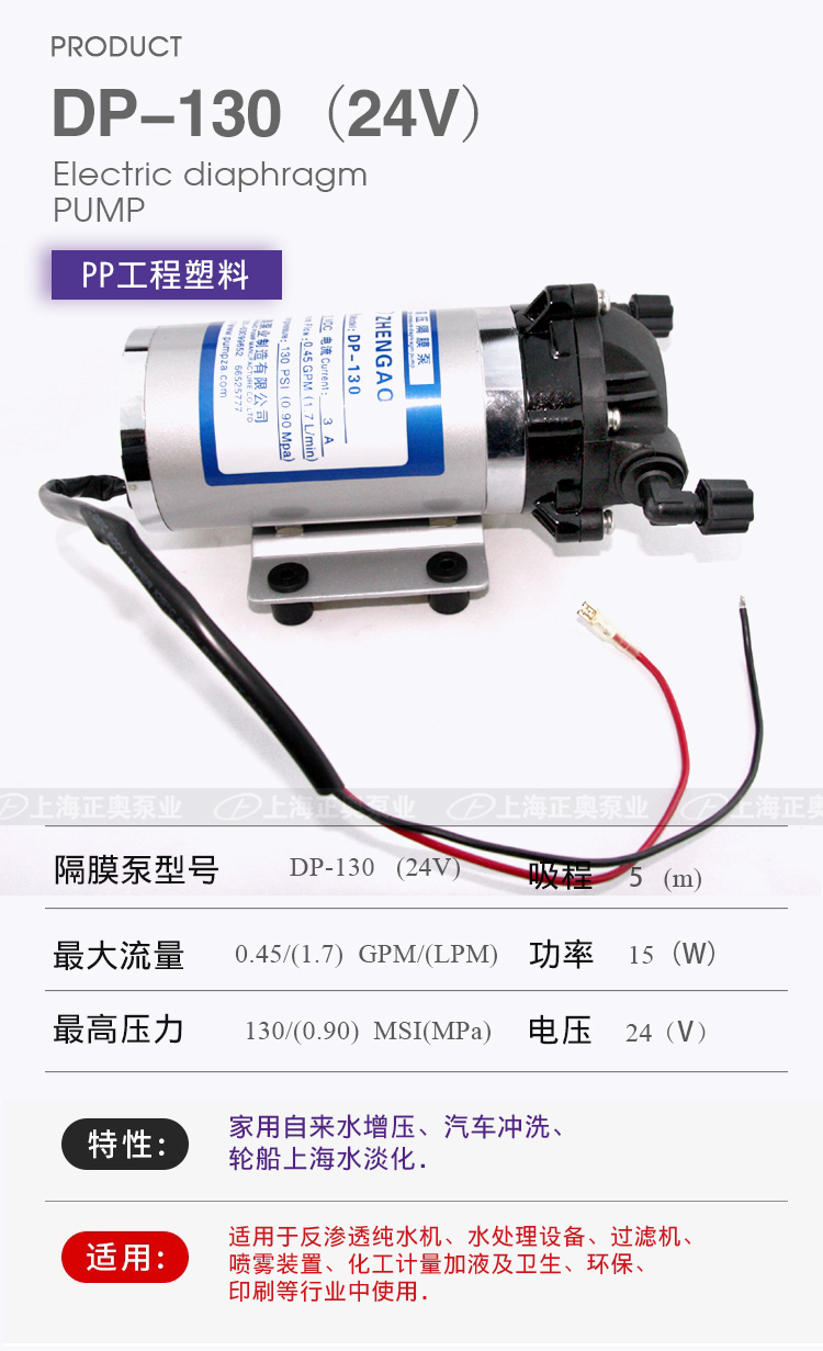 DP微型電動隔膜泵適用于家用自來水增壓、汽車沖洗、輪船上海水淡化,DP隔膜泵適用于反滲透純水機、水處理設備、過濾機、噴霧裝置、化工計量加液及衛生、環保、印刷等行業中使用。