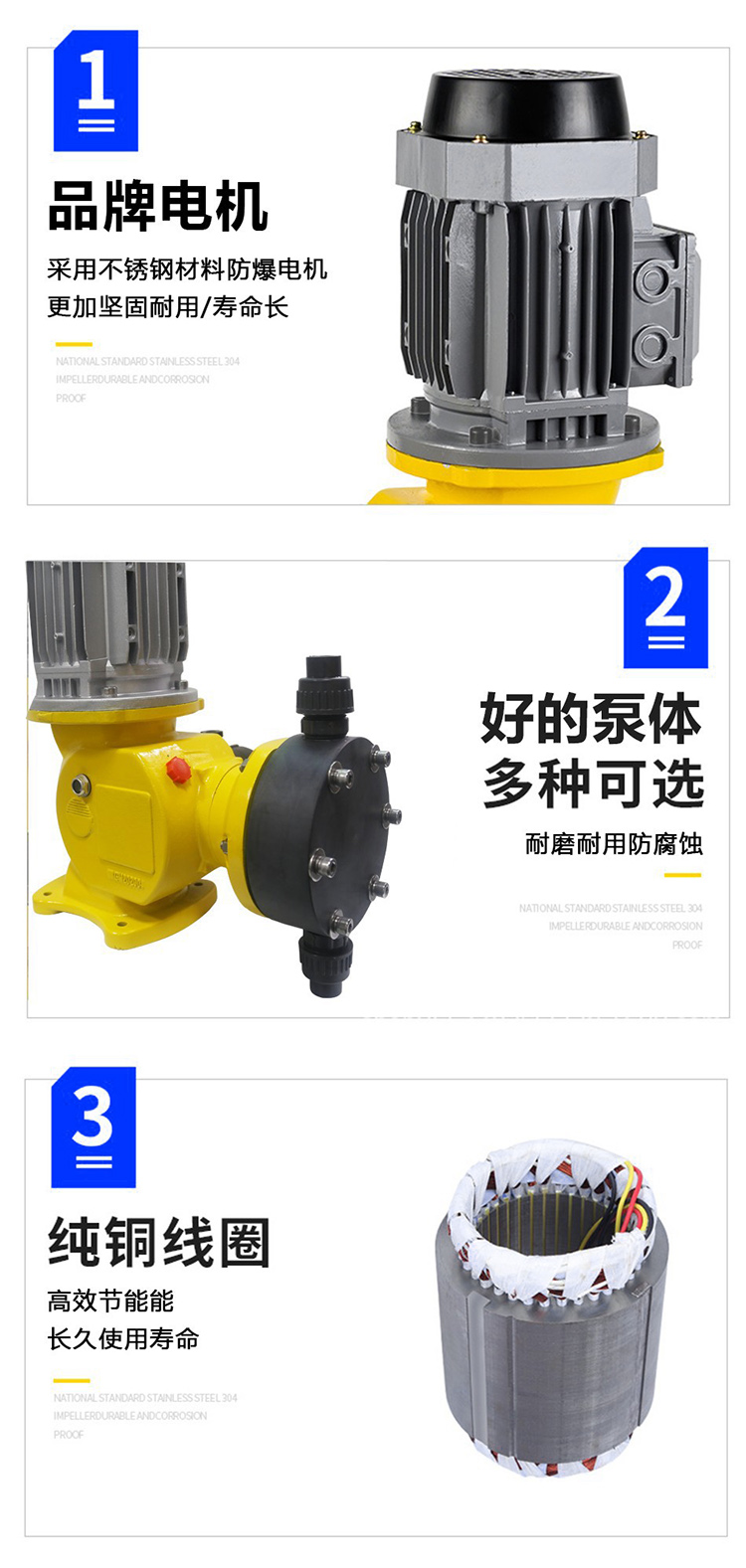 1、鑄鋁殼體,散熱性能高,整體重量輕,適用各種酸堿藥液,無(wú)毒無(wú)味。