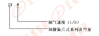 例如:2X-8    2 - 代表雙級(jí)   X - 代表旋片式真空泵     8 - 每秒鐘抽氣速率為8