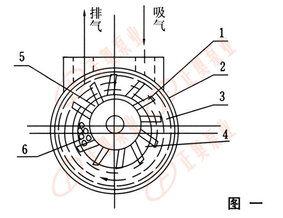 該泵為懸臂式結構,如圖一所示、葉輪(1)偏心的裝在泵體(2)內,因此當葉輪旋轉時,水受離心力的作用,在泵壁上形成一旋轉水環(3),水環上部與輪轂相切,沿箭頭方向旋轉,在前半轉的過程中,水環內表面逐漸與輪轂脫離,因此在葉輪片問形成空間并逐漸擴大,這樣就從吸氣口吸入氣體,在后半轉的過程中,水環內表面逐漸與輪轂靠近,葉片問的空間體積逐漸減小,葉片問的氣體被壓縮而排出。