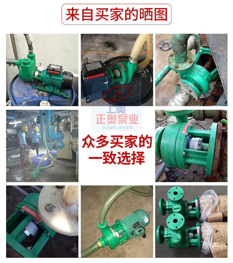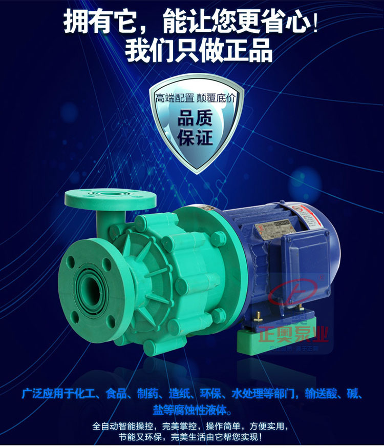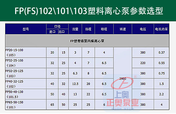 正奧公司生產的101型、102型、103型、104型、105型泵系單吸直聯式塑料離心泵是一種小型塑料泵,產品結構、體積小、重量輕、耗電省、耐酸堿、密封好、維修方便。FS型工程塑料離心泵系列產品均采用機械密封,并引進國際工藝和技術配方,全使用改性ABS(工程塑料)作為泵的材質,在同系列的塑料泵產品中,充分顯示了其結構重量輕、體積小、壽命長等特點,廣泛應用于化工,食品、制藥、電鍍、造紙、環保、水處理等部門,輸送酸、堿、鹽等腐蝕性液體。其中104型采用220V電壓,可供家庭選用。