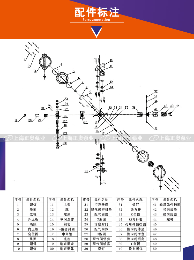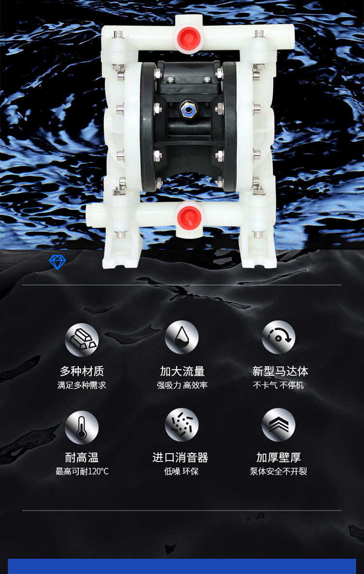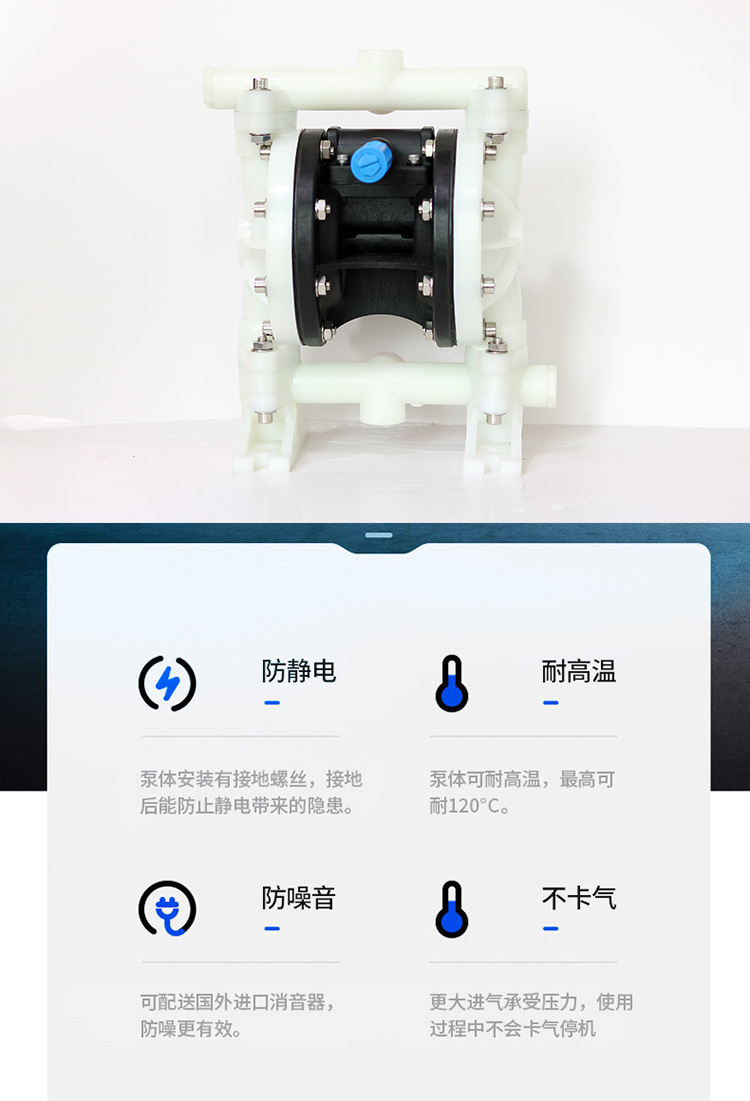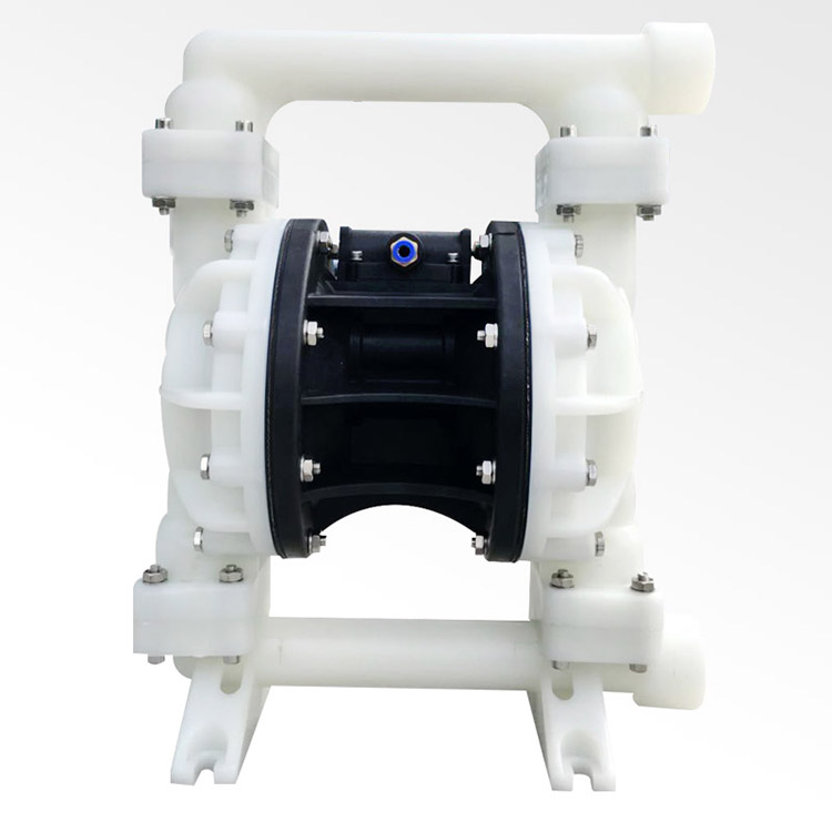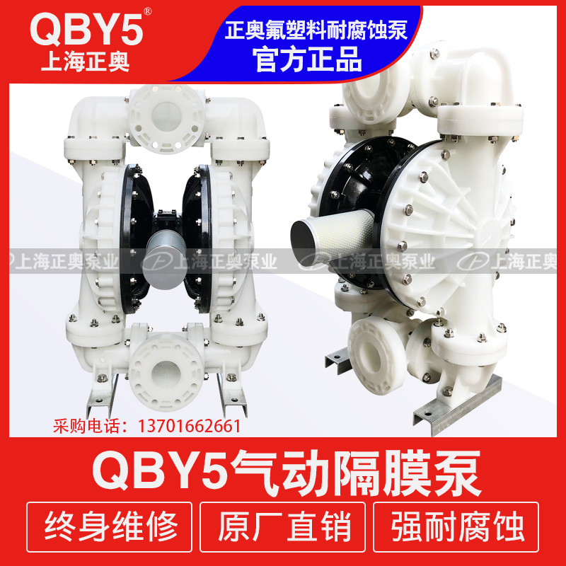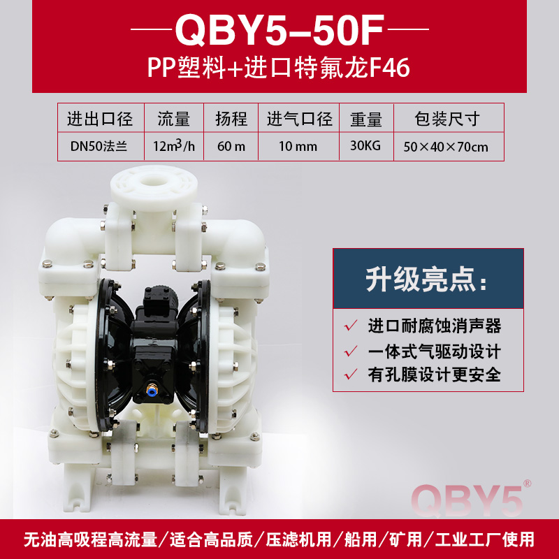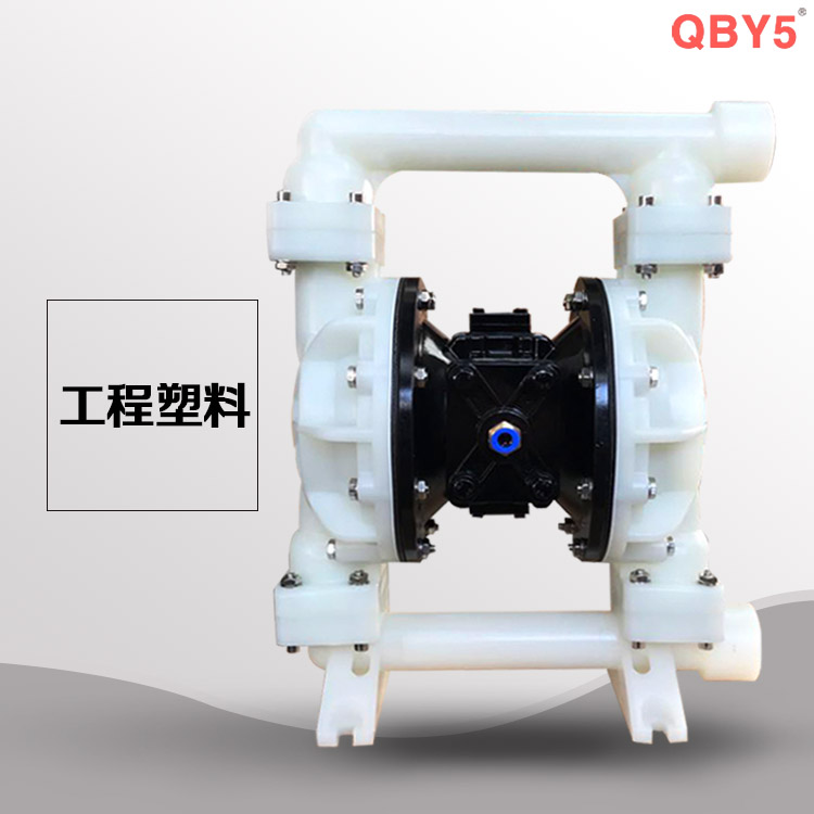 QBY5-F型塑料氣動隔膜泵是目前國內新穎的一種采用壓縮空氣為動力源,通過氣閥往復運動分配空氣,帶動隔膜擠壓輸送介質的容積式泵,該泵集雜質泵、自吸泵、泥漿泵、屏蔽泵、潛水泵等輸送機械的優點。聚丙烯塑料塑料氣動隔膜泵是一種新型輸送機械,是目前國內新穎的一種泵類。采用壓縮空氣為動力源,對于各種腐蝕性液體,帶顆粒的液體,高粘度、易揮發、易燃、劇毒的液體,均能予以抽光吸盡。其性能參數與聯邦德國的WLLDENPVMPS、美國的MARIOWPUMPS相近。 有4種規格直徑:∮10mm(3/8〃)、∮15mm(1/2〃)、∮25 mm(1〃)、∮40mm(11/2〃)。隔膜片根據不同液體介質分別采用丁晴橡膠、氯丁橡膠、聚四氟乙烯、等滿足不同用戶的需要。