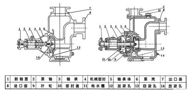 該泵的特點是結構簡單可靠,經久耐用。在泵正常情況下,一般不需要經常拆幵保養。當發現故障后隨時給予排除即可。 1.維護該泵時應注意幾個主要部位: a. 滾動軸承:當泵長期運行后,軸承磨損到一定程度時,須進行更換。 b. 前密封環、后密封環:當密封環磨損到一定程度時,須進行更換。 c. 機械密封:機械密封在不漏液的情況下,一般不應拆幵檢查。若軸承體下端泄漏口處產生嚴重泄漏時,則應對機械密封進行拆檢。裝拆機械密封時,必須輕取輕放,注意配合面的清潔,保護好靜環和動環的鏡面,嚴禁敲擊碰撞。因機械密封而產生泄漏的原因主要是摩擦付鏡面拉毛所至。其修復辦法,可對磨擦付端面進行研磨使恢復鏡面。機械密封產生泄漏的另一原因是"O"'形橡膠密封圈(或緩沖墊)安裝不當、或者變形老化所至。此時則需調整或更換"O'形密封圈進行重新裝配。 2.泵拆裝順序: a. 拆下電動機或脫出聯軸器。 b. 拆出軸承體總成,檢查葉輪和前口環的徑向間隙,檢查葉輪螺母有無松動。 c. 拆下葉輪螺母,拉出葉輪,檢査葉輪和后密封環的徑向間隙。 d. 松出機械密封的緊定螵釘,拉出機械密封的動環部分,檢查動、靜環端面的貼合情況,檢查“O”形密封圈〔或緩沖墊)的密封情況。 e. 旋出聯軸器的緊定螺母,拉出聯軸器。 f. 拆下軸承端蓋,拆出泵軸和軸承。 g.安裝時以相反順序進行裝配即可。