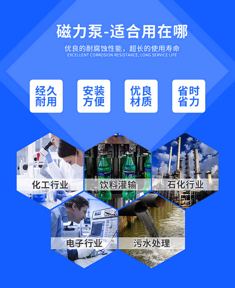 磁力泵結(jié)構(gòu)緊湊、外形美觀、體積小、噪音低、運(yùn)行可靠、使用維修方便。可廣泛應(yīng)用于化工、制藥、石油、電鍍、食品、電-影照相洗印、科研機(jī)構(gòu)、國(guó)防工業(yè)等單位抽送酸、堿液、油類、稀有貴重液、毒液、揮發(fā)性液體,以及循環(huán)水設(shè)備配套、過濾機(jī)配套。特別是漏、易燃、易爆液體的抽送,選用此泵則更為理想。