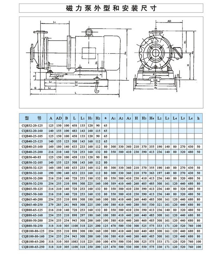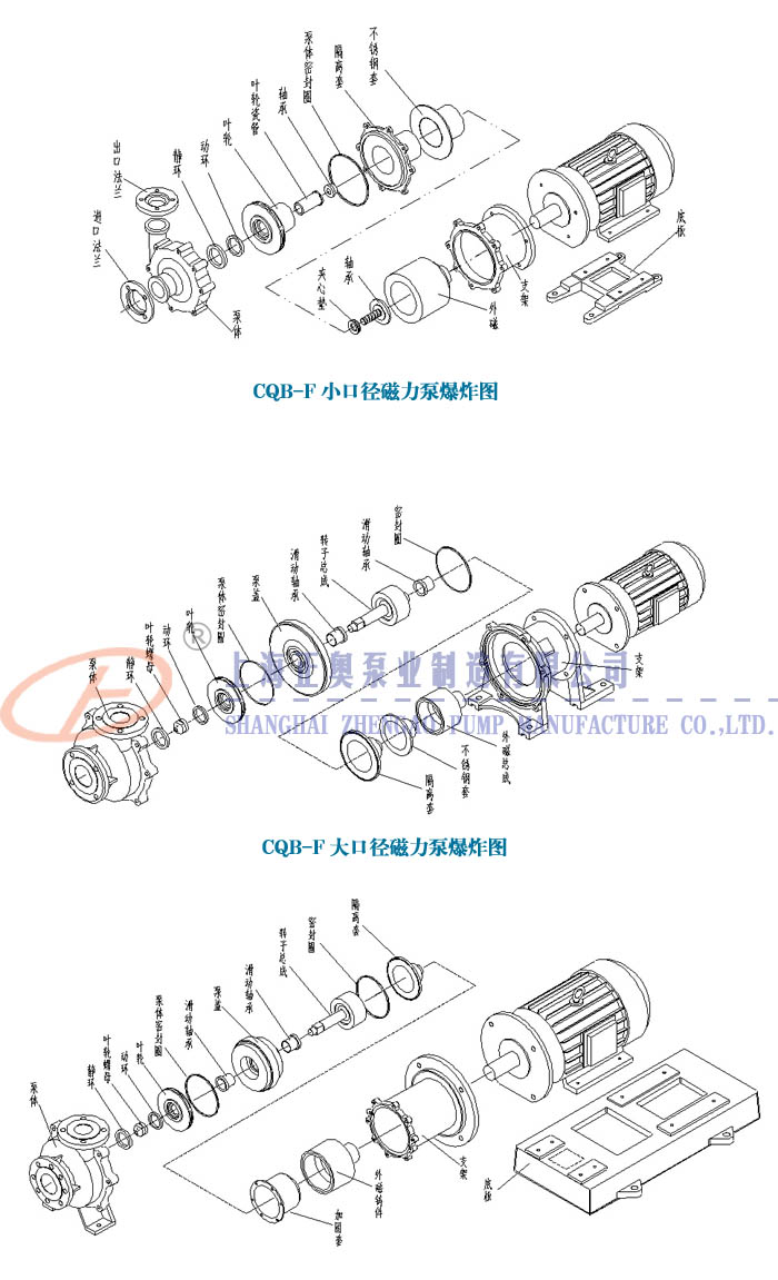 CQB-F型氟塑料磁力驅動泵,采用磁力耦合傳動,不存在動密封點,因此杜絕了一般軸傳動式離心泵軸封處跑、冒、滴、漏的現象。其過流部件采用氟塑料及高純度工業陶瓷制成,具有優異的耐腐性及密封性。CQB-F氟塑料磁力泵設計獨特,無需機械軸封,不滲漏,液體過流部件選用氟塑料,陶瓷、氟橡膠等材料,泵體外殼用金屬材料固定,故泵體足以承托管道的重量,使用保養為方便。小于DN50mm的為全氟塑料磁力驅動泵。