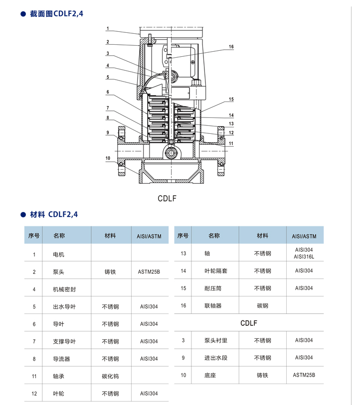 CDL/CDLF為安裝標準電機的非自吸式多級離心泵,電機軸通過泵頭用軸聯器直接與泵軸連接,拉桿螺栓將耐壓筒、過流部件固定在泵頭和進出水段之間,泵進出水口在泵底同一直線上;本泵可根據需要配置智能保護器,對泵干轉、缺相、過載等進行有效保護。