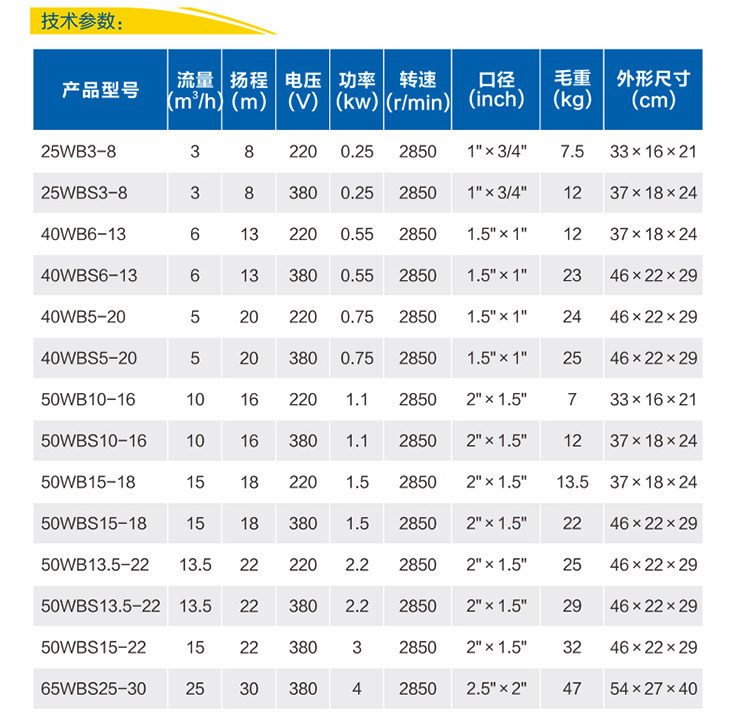 產品型號 最大流量(m3/h) 最高揚程(m) 額定功率(kW) 電壓(V) 口徑(mm) 毛重(kg) 包裝尺寸(cm3)